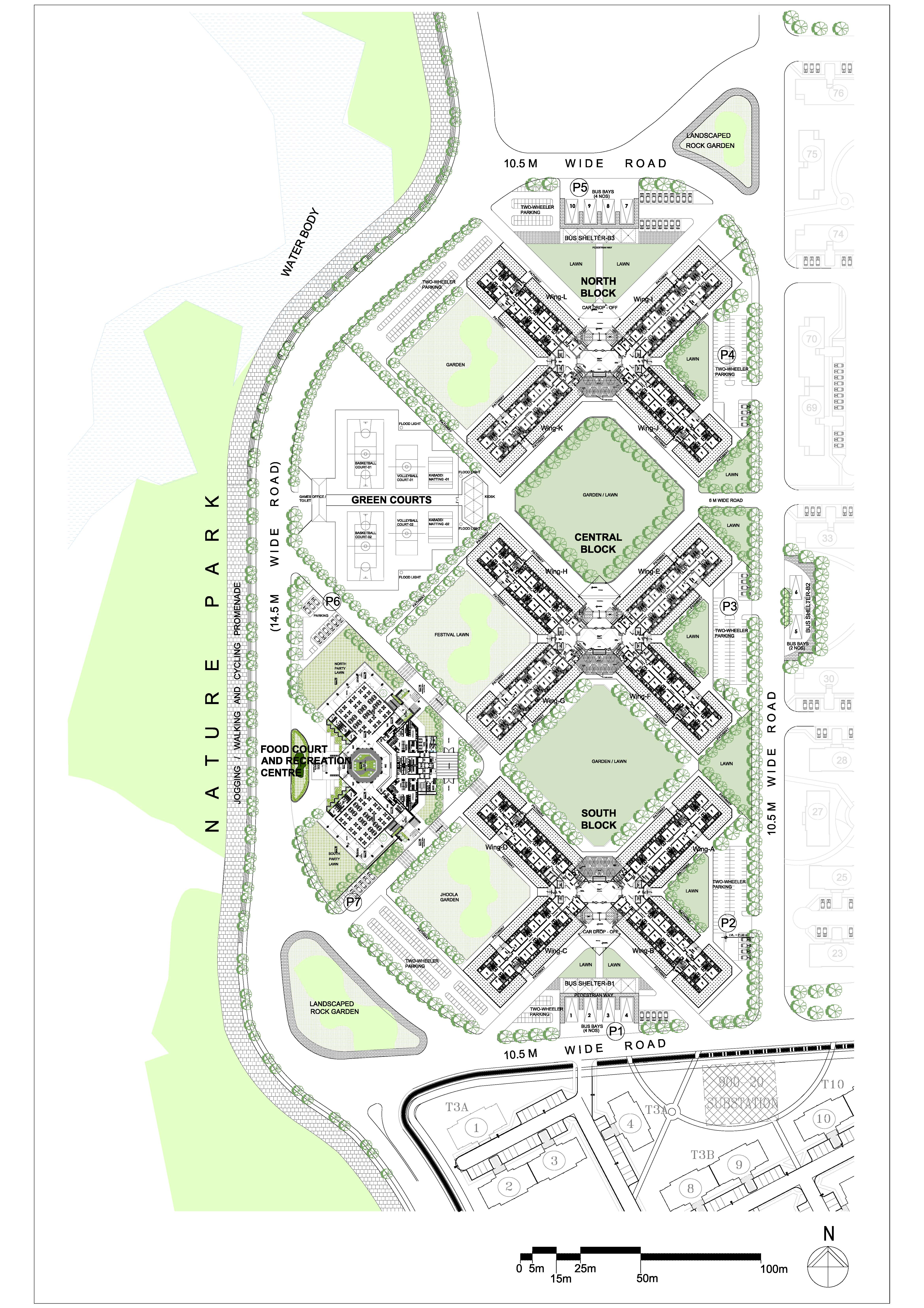 The Central double-level octagonal Courtyard is the singular anchoring element around which the facility arranges itself - much like the manner in which the entire Township pivots around the Central Park and its Central Lake.
