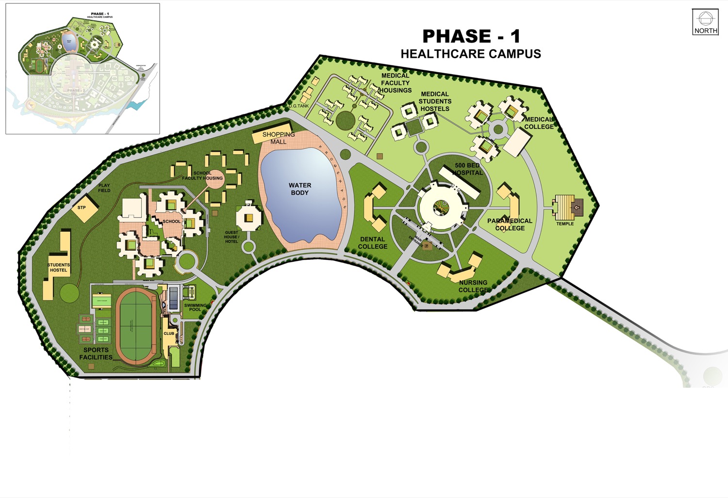 These are the Medical College, Dental College, Nursing College, Physiotherapy College & Hospital - approximately 7 Lacs Sq. Ft. The balance works of approx., 10 Lacs Sq. Ft. Phase-2 will consist of the following facilities: