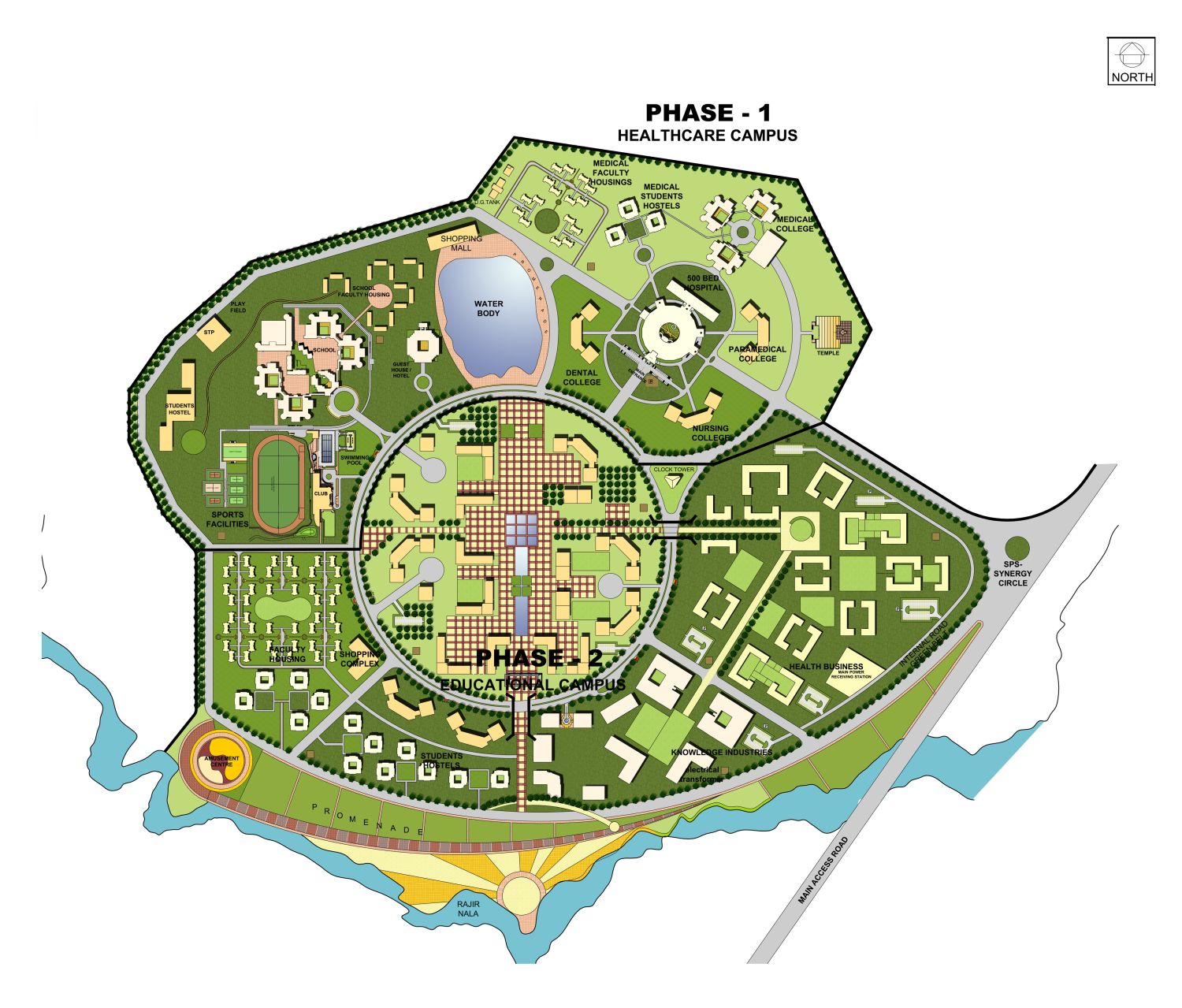 SPS Synergy Knowledge & Health City is Promoted by the – Synergy Foundation a Joint Enterprise of SPS Group & Synergy Group. The Client intends of creating a World-Class Health & Education Infrastructure. The 300 acre, first of its kind, Knowledge & Health City in India, would comprise of 500 Bed Hospital with Medical College, Super Speciality Hospitals, Nursing, Pharmacy & Dental College, Allied Health Science College, Management, Media & Technology College, Shopping Mall, Indoor & Outdoor Stadium, Health Hotel, Residential Complex and all other amenities for a self-sustained township.